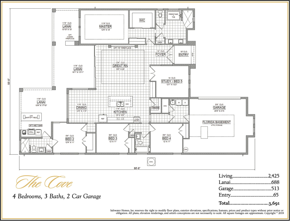 Boasting a Hacienda exterior, the Cove features an oversized kitchen that opens into the great room, creating an open concept within this 4 bedroom, 3 bathroom home. The master ensuite highlights include separate His and Hers closets, double vanity sinks, a generous soaker tub and walk in shower. The lanai spans the width of the home and an optional summer kitchen, bartop table, and 3 sided fireplace can really make this plan perfect for Florida outdoor living
