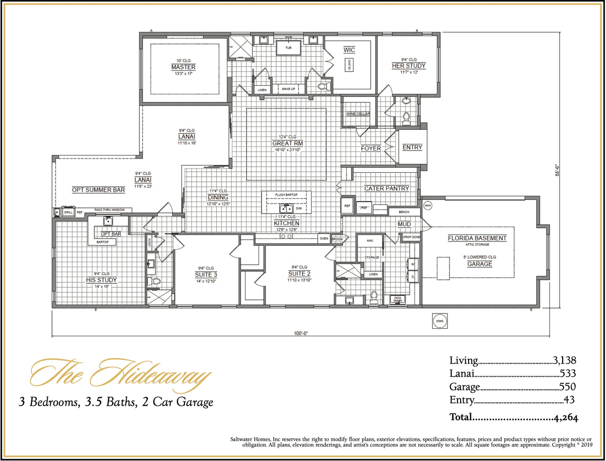 A fitting name for a home you’ll never want to leave, the Hideaway’s exterioris just the beginning of the unique characteristics of this home. Some ofthese features include a grand master suite, his and her studies, a cater pantry,wine cellar, and an oversized laundry room with a dog wash station. Guestscan enjoy their private suites in this expansive split and open floor plan. Outdoor living is a must with the oversized lanai that includes plenty of room for an optional summer kitchen that can be opened to the adjacent bar in the study.