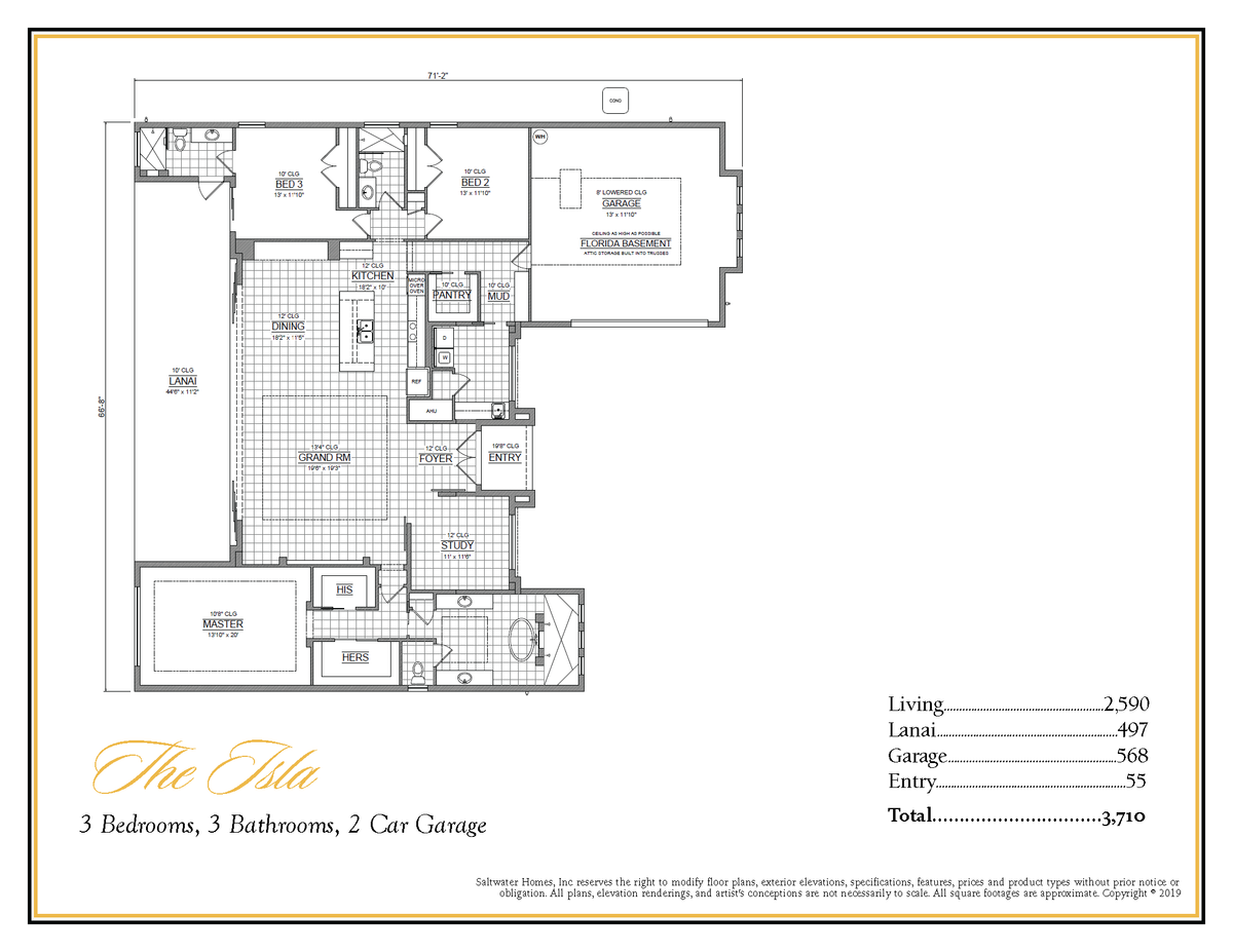The Isla offers 3,710 total square feet with 2,590 square feet of living space. The open layout centers around a spacious grand room with 13-foot ceilings that flows into the dining area and kitchen, creating a seamless living and entertaining space. The kitchen features a large island, walk-in pantry, and direct access to a mudroom area. The private owner’s suite includes dual walk-in closets, a large bath, and direct access to the lanai. Two additional bedrooms and a shared bath are located on the opposite side of the home, providing privacy for guests. The plan also includes a front study with 12-foot ceilings, a covered lanai extending nearly the full width of the home, and a two-car garage. The exterior presents a refined, Cape Dutch façade that highlights natural light and grand curb appeal.