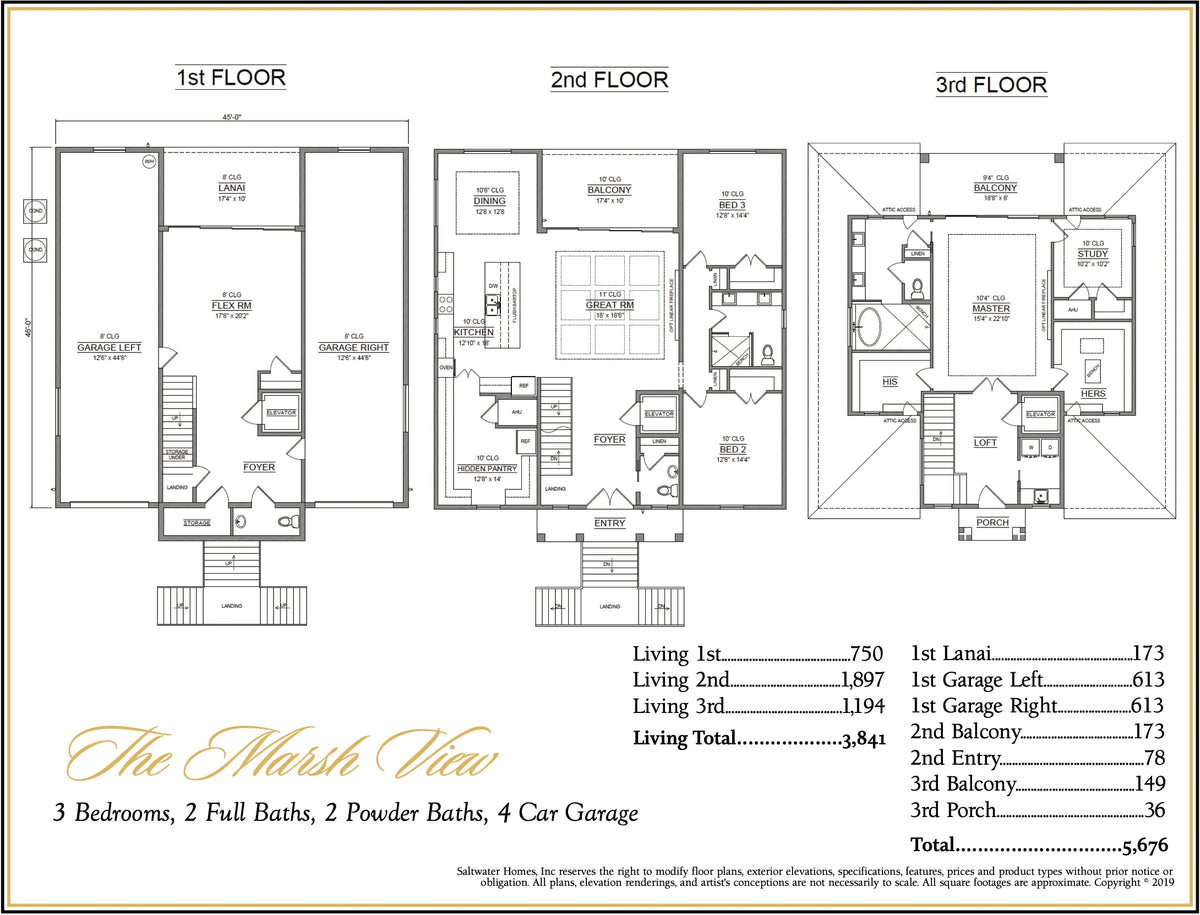The Marsh View is the epitome of luxury coastal living. The symmetrical exterior boasts a low country flare with two deep garages and a split stair case leading to the front doors. The first floor includes a large flex space and an elevator that ascends to all three floors. This almost 5,700 square foot home has an open concept floorplan with the kitchen, dining, and great room sharing one large area. Directly off the kitchen is an enormous hidden pantry with great space for a custom scullery. The secluded and expansive master suite is located on the third floor where you will also find oversized his and her closets, a laundry room, and a study. The master suite has potential for beautiful views out the rear of the home.