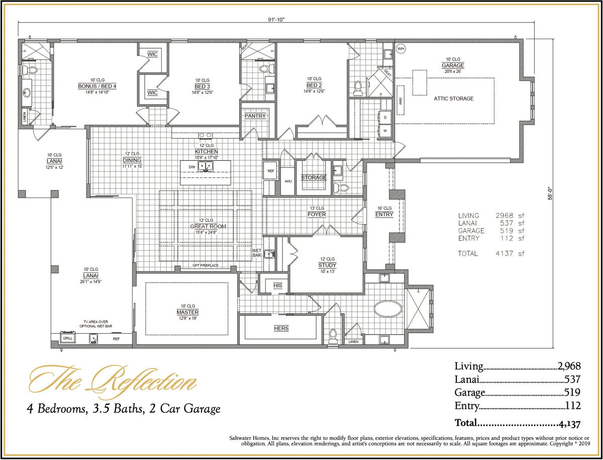 When looking at the Reflection, you are greeted by a grand exterior entryway that towers over the rest of the home. Stepping foot into the front door, you will find a large foyer and study. The open concept, split floorplan is great for any host as each guest can enjoy their own private suite during their stay. Tall ceilings, a large storage room, a wet bar, and a powder bath are a few of the sweet features this home includes.