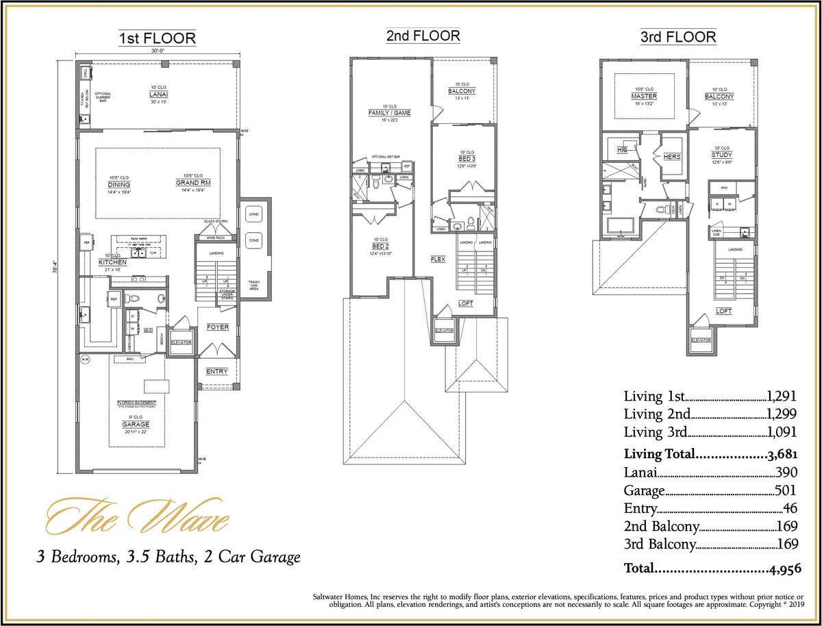 The Wave is designed with much thought to its open floorplan and view oriented layout. This floorplan provides casual living while creating a functional space for hosting guests with the kitchen, dining, great room, and outdoor living all in the same area. The oversized pantry is sure to impress any host! The second floor is home to the guest bedrooms and the third floor is a private retreat dedicated to the master suite. Key features of the wave include an elevator, two laundry rooms, a wine display, a family or game room, and outdoor living on all three levels.